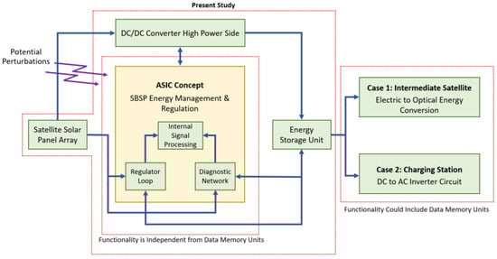 Overall, the hypothetical hybrid BMS would consist of both computational processes, being considered as a topic for future study, as well as non-computational approaches, being the main considerations in the presently developed ASIC concept. Splitting a SBSP supply control unit from programmable memory involves implementing this solution as a mixed-signal circuit; this results in achieving the functionalities described in Figure 2 in a single, custom-designed integrated circuit.