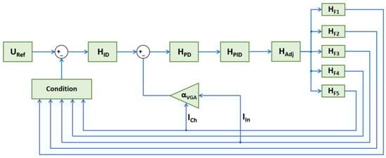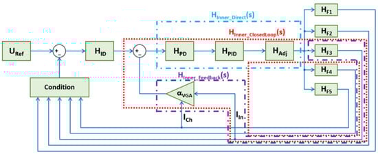 Based on the previous equation, the inner closed-loop transfer function was calculated by considering the control voltage transformation into a duty factor, followed by obtaining the input current feedback voltage based on the duty factor, the current-to-voltage gain transfer function, and the VGA gain transfer function. The charging current path was not considered in the mathematical model due to the non-linear conditioning.