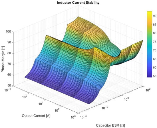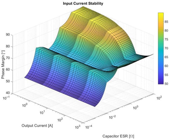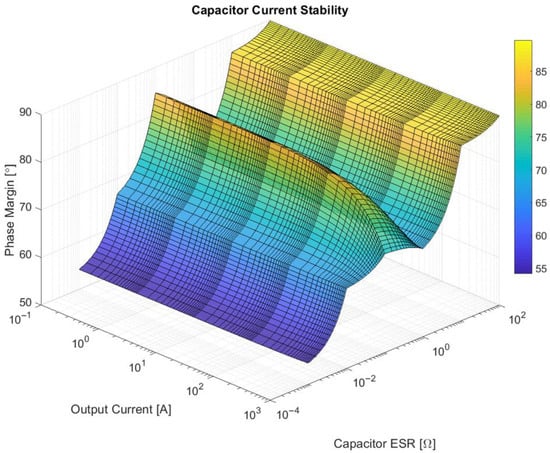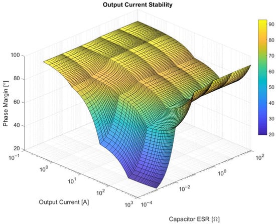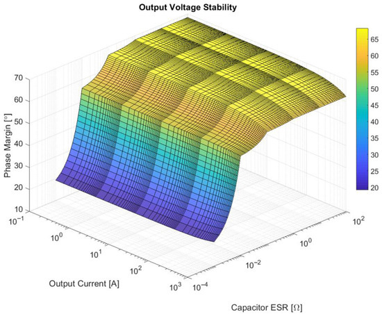 The system stability analysis shows, in this case, a similar value of 55 degrees for operating at ideal capacitor ESR values. Mostly, the output current has a reduced influence on the phase margin values, and only during short-circuit operation does the phase margin slightly decrease at loads corresponding to 1000 amperes or output resistances close to 30 milliohms. At high capacitor ESR values, an increase in phase margin of approximately 90 degrees can be observed, having the region for this phase margin value at approximately 0.5 ohms, corresponding to the capacitor ESR.
