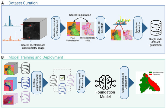 While such DL models reduce diagnostic subjectivity, they are still dependent on the quality and availability of a prepared histopathology slide. Recently, DL models for point-based mass spectrometry modalities have been implemented in clinical settings, and alleviate the reliance on structural information, instead of focusing on molecular signatures. One such example, is the intraoperative characterization of tissues in surgical resections. ImSpect [19] surpassed previous benchmarks with an area under the receiver operating curve of 81.6%, demonstrating solid performance in margin assessment. On a broader scale, foundation models have been created or adapted to point-based mass spectrometry. For example, Deep Representations Empowering the Annotation of Mass Spectra, or DreaMS [20], is a foundation model trained on an extensive tandem mass spectrometry dataset. Similarly, our group recently introduced FACT, a foundation model for assessing cancer tissue margins from rapid evaporative ionization mass spectrometry (REIMS) [21]. FACT leverages transfer learning from a language–audio foundation model, capitalizing on the structural similarity between spectral data and audio signals to enable accurate classification of cancerous tissue.