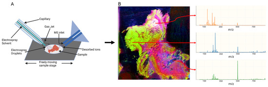 (A) Schematic of desorption electrospray ionization (DESI) mass spectrometry, where charged droplets impact the tissue surface to desorb ions for analysis. (B) Resulting principal component analysis (PCA) visualization of DESI-MSI data from a tissue biopsy sample. Each pixel corresponds to a mass spectrum, with representative spectra shown for selected pixels.