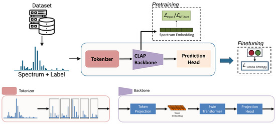 FACT employs transfer learning via the CLAP model to process and classify mass spectra, leveraging its capacity to interpret spectral patterns analogous to those found in audio signals. Since CLAP was originally developed as a general-purpose audio–language foundation model, repurposing it for spectral data enables cross-domain transfer of pretrained representations. The model backbone consists of the audio encoder from CLAP, along with its associated projection layers. These are preceded by a token projection layer and followed by an embedding projection head. The spectra are tokenized by splitting them into non-overlapping 64-bin windows, which are projected into a 96-dimensional embedding space before being passed to the audio encoder—a Swin transformer [29]—as a sequence. The encoder acts as a feature extractor, processing the tokens and combining the features in a 512-dimensional embedding vector. A 2-layer multi-layer perceptron (MLP) head is used to classify the input spectrum. This architecture (Figure 3) is also used for two other CLAP-based models in this study, which differ from FACT only in their pretraining strategies.