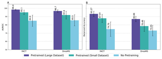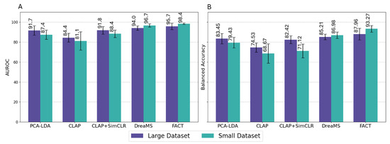 Figure 4 depicts the results of training on the large dataset relative to the small dataset. In comparing the performance of the models when trained on the small dataset, FACT achieved the highest mean AUROC () and balanced accuracy (), outperforming both DreaMS (AUROC: ; BalAcc: ) and PCA-LDA (AUROC: ; BalAcc: ). These differences were statistically significant, with FACT outperforming all other models. DreaMS also showed statistical significance over PCA-LDA and CLAP in both metrics.