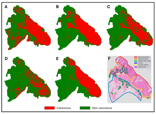 Figure 6 demonstrates the output of the deployment module for each of the five models from the comparative analysis. The pathologist-annotated histopathology slide is pictured as well. Noticeably, the output from the FACT model (Figure 6E) demonstrates better localization within the cancerous region than the other models.