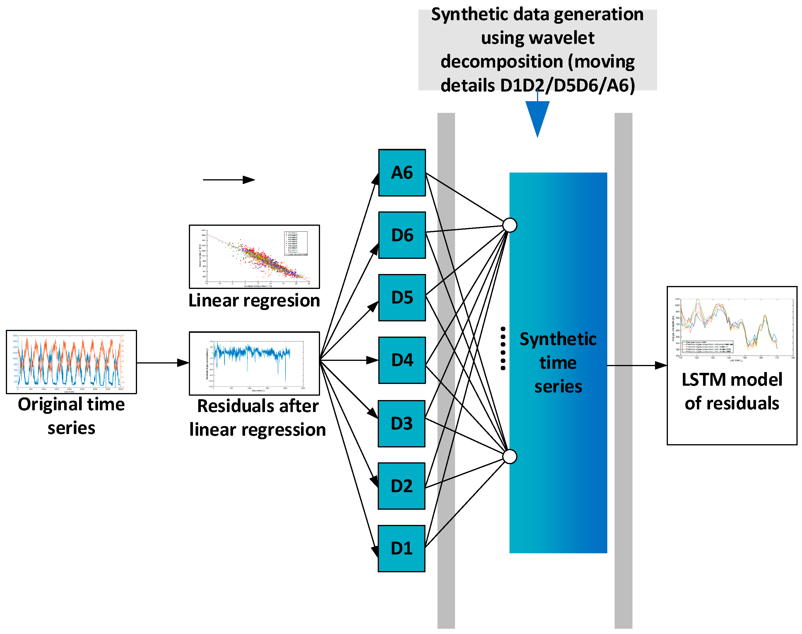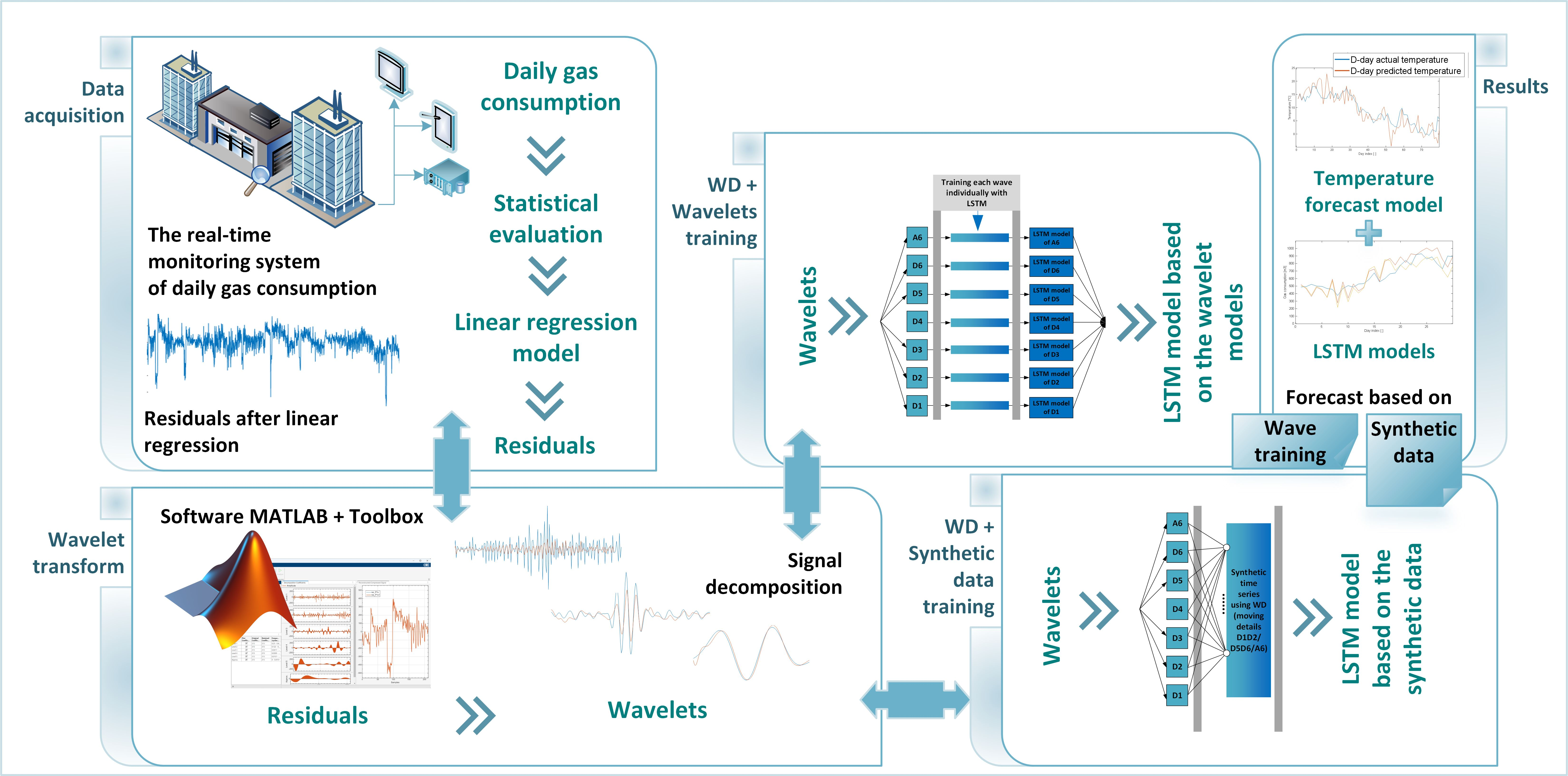 - Two LSTM models will be prepared using different approaches based on actual gas consumption at real temperature values. In the first, the model will be trained with augmented synthetic data generated via the wavelet transform. In the second step, each component of the wavelet decomposition will be trained separately, and the final model will then be constructed.