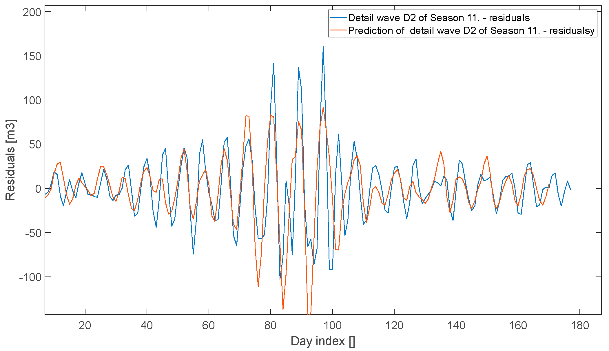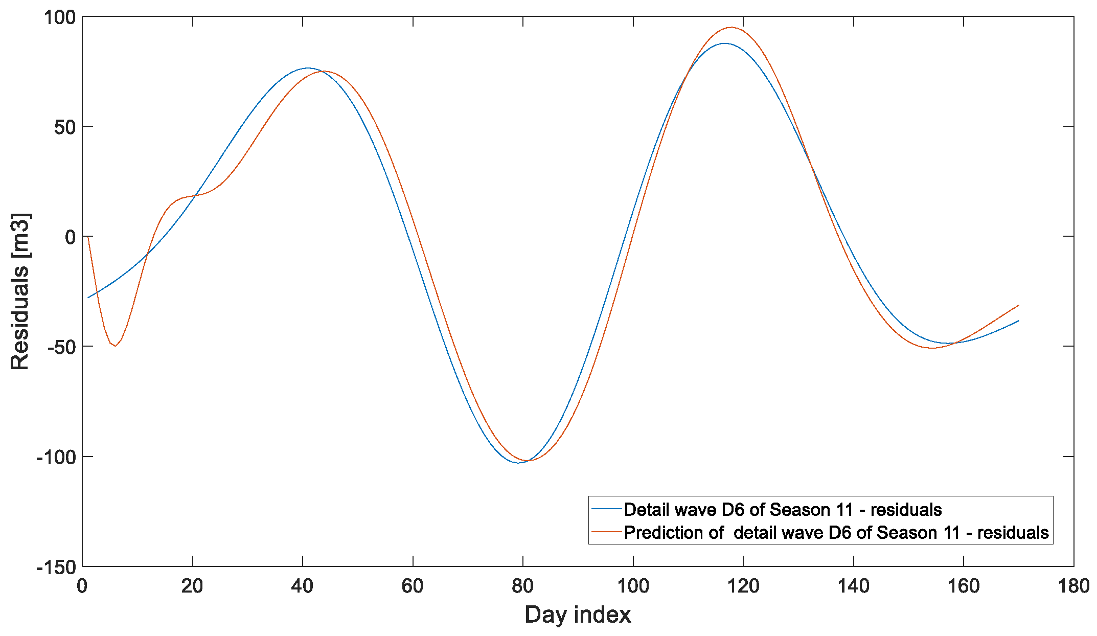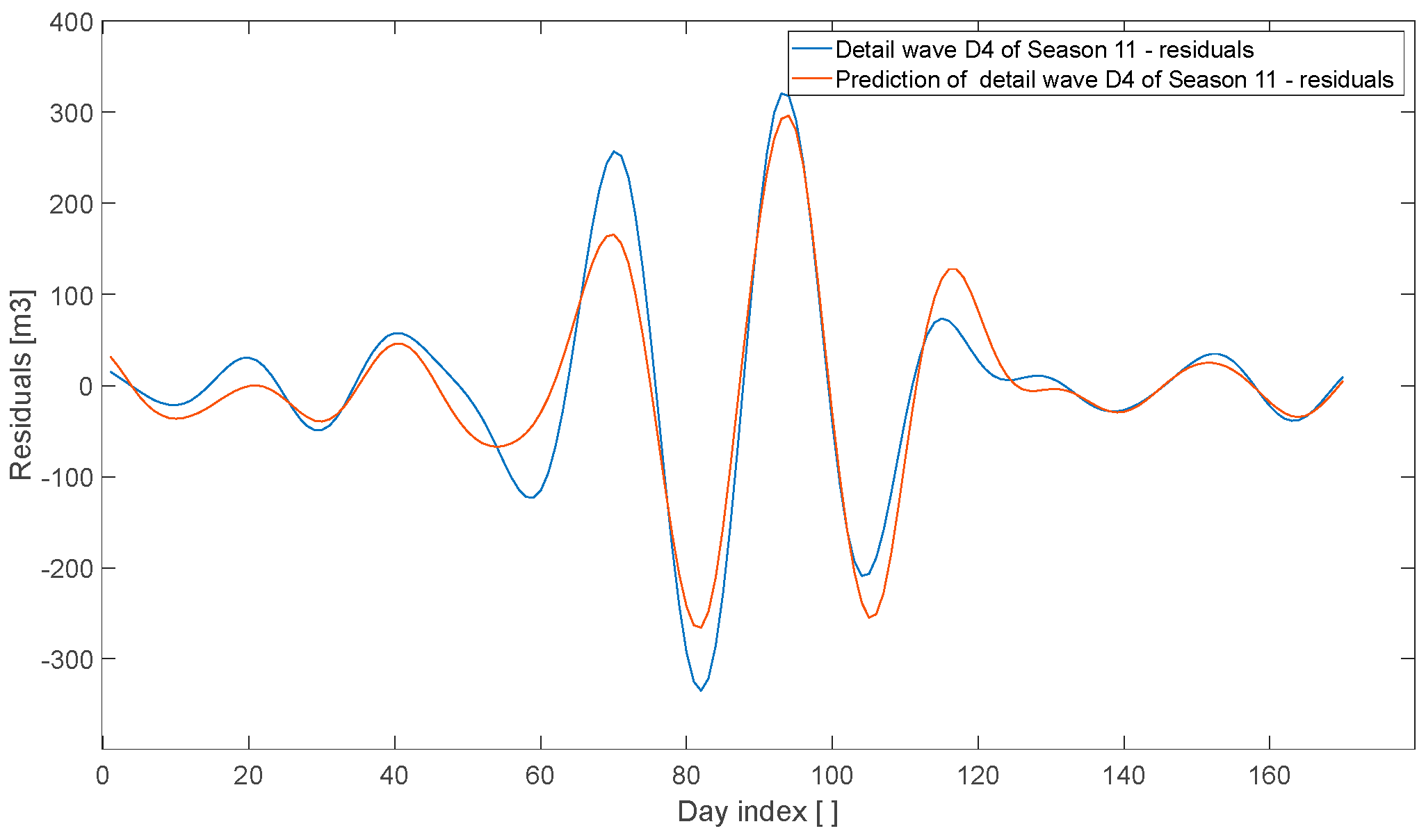 - The second approach excluded synthetic data entirely. The Wavelet Transform was applied and proposed to improve prediction accuracy by forecasting each wavelet component individually (see Figure 20, Figure 21, Figure 22, Figure 23, Figure 24, Figure 25 and Figure 26). The residual prediction was obtained by summing the predicted wavelet components, and the final gas consumption forecast was reconstructed by adding the previously separated linear component (temperature-dependent). The results, presented in Figure 27, show a 66% improvement in both nMAE and NRMSE compared to the previous approach. This methodology proved significantly more robust in handling operational downtimes during the winter holiday period. Specifically, we achieved nMAE = 5.71% and NRMSE = 7.80%.