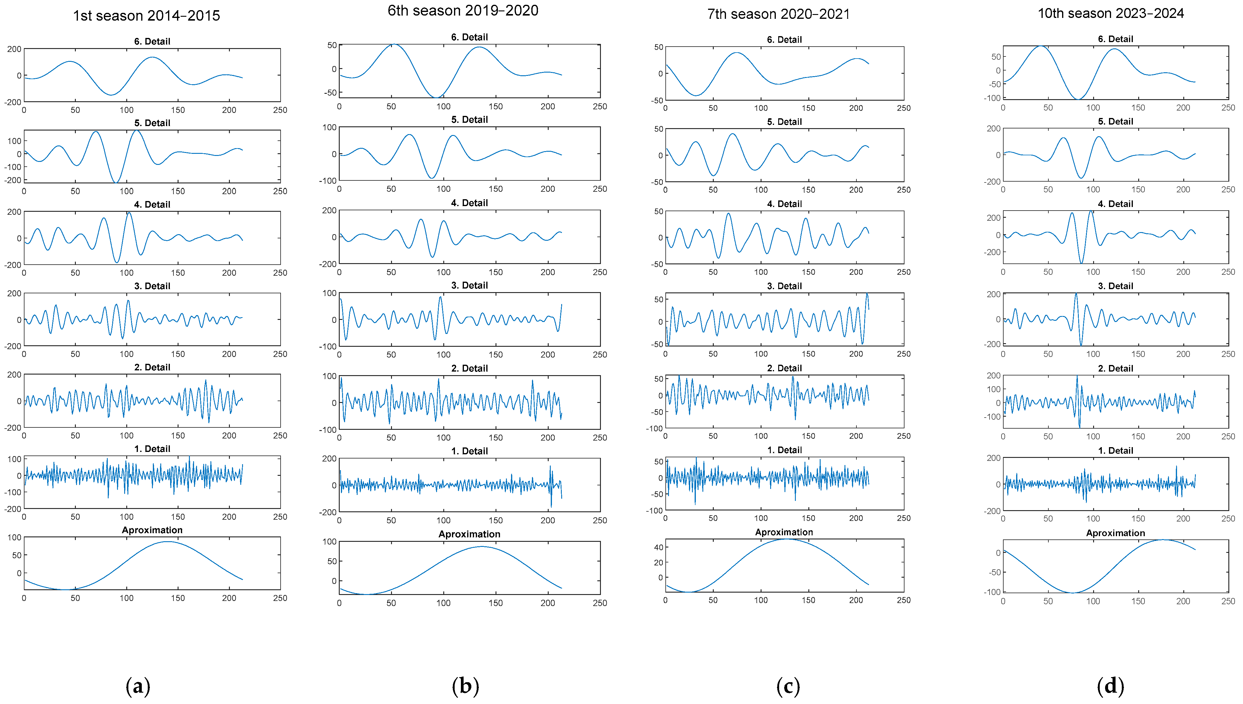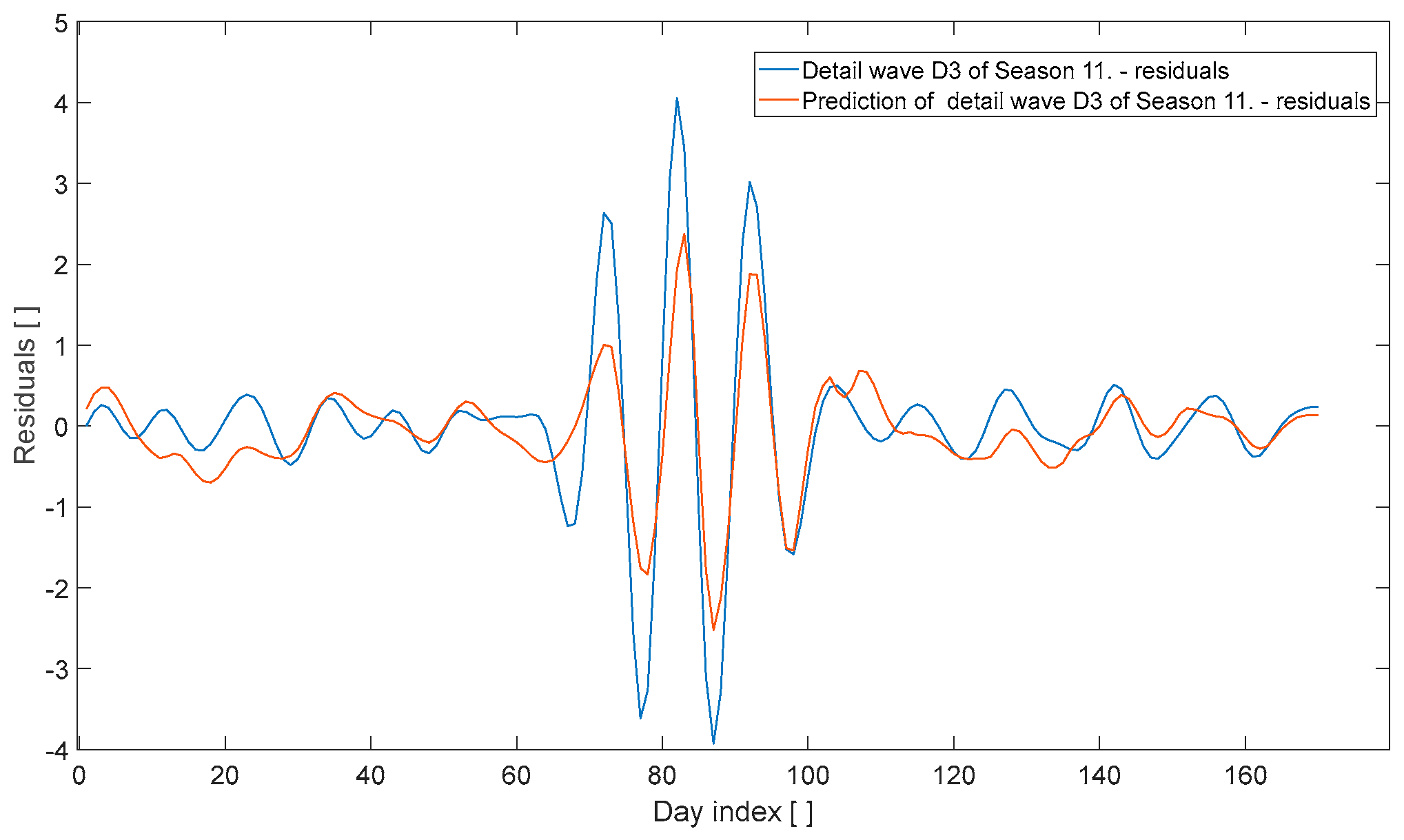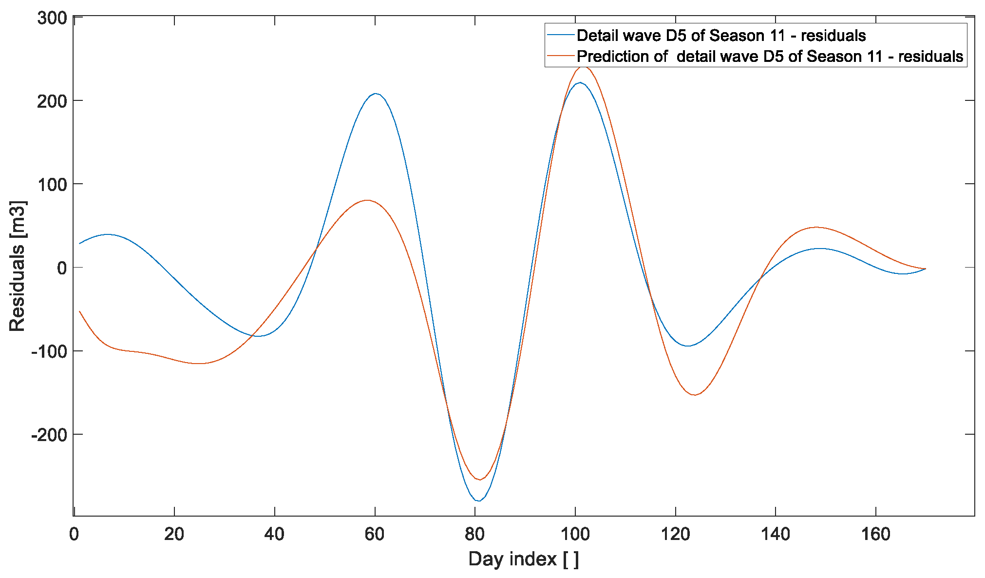 - The second approach excluded synthetic data entirely. The Wavelet Transform was applied and proposed to improve prediction accuracy by forecasting each wavelet component individually (see Figure 20, Figure 21, Figure 22, Figure 23, Figure 24, Figure 25 and Figure 26). The residual prediction was obtained by summing the predicted wavelet components, and the final gas consumption forecast was reconstructed by adding the previously separated linear component (temperature-dependent). The results, presented in Figure 27, show a 66% improvement in both nMAE and NRMSE compared to the previous approach. This methodology proved significantly more robust in handling operational downtimes during the winter holiday period. Specifically, we achieved nMAE = 5.71% and NRMSE = 7.80%.