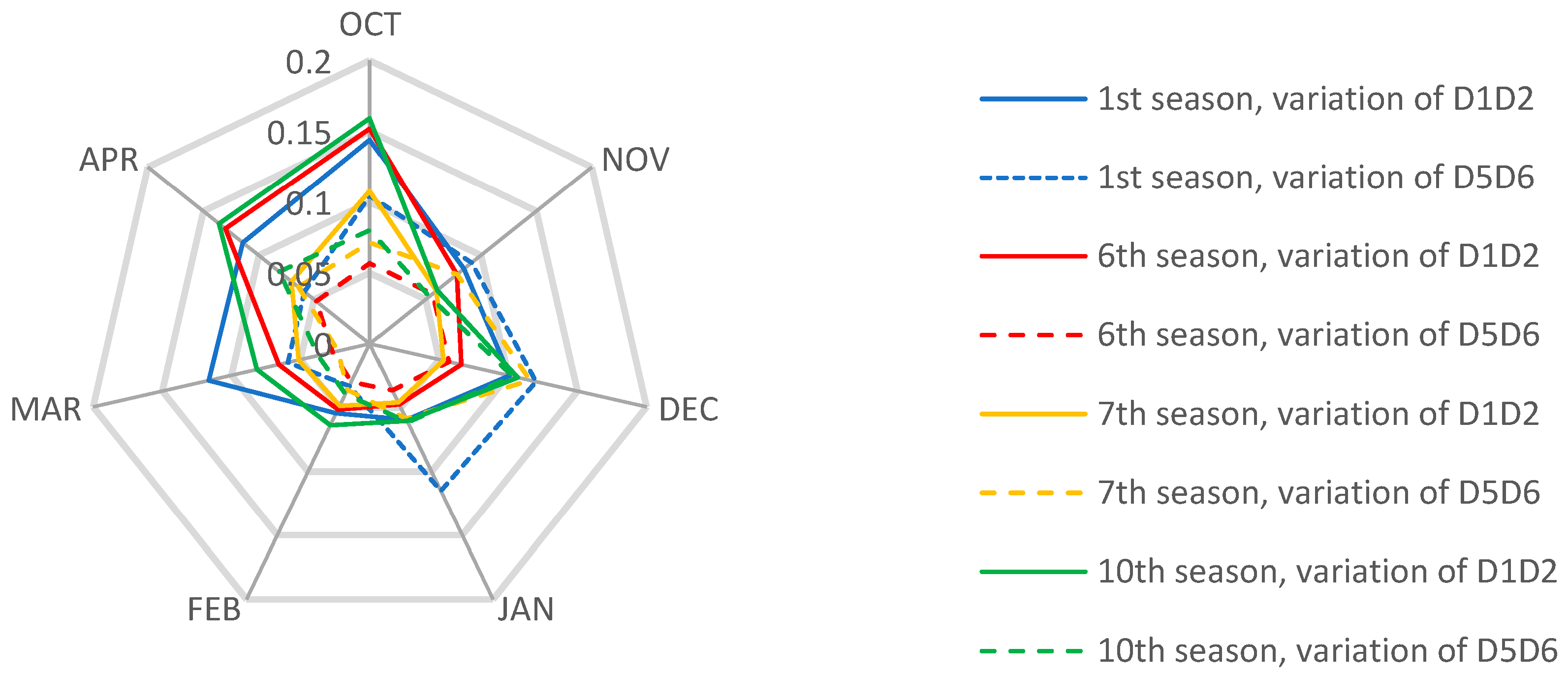 1st season, variation of D1D2 | 0.144 | 0.085 | 0.101 | 0.059 | 0.054 | 0.116 | 0.114 |