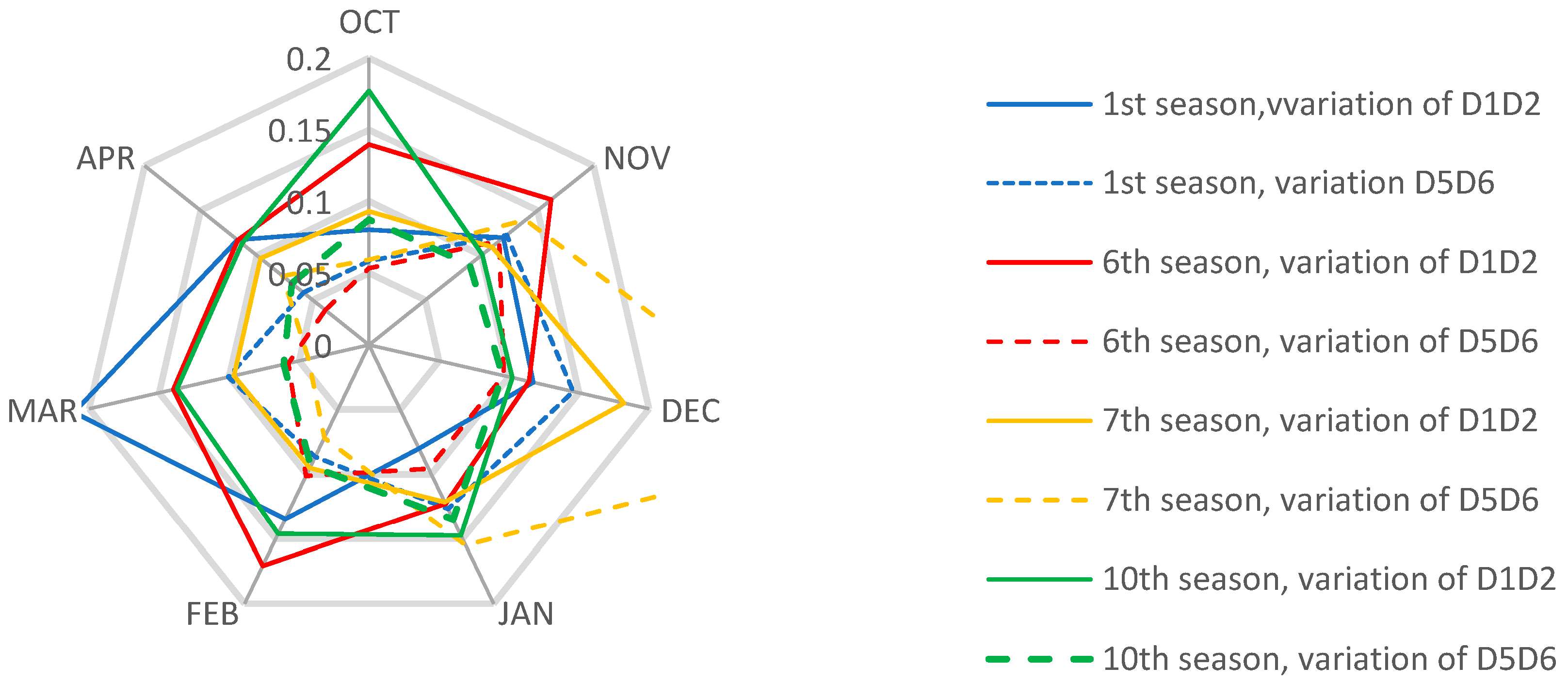 10th season, variation of D1D2 | 0.159 | 0.060 | 0.107 | 0.060 | 0.067 | 0.082 | 0.136 |