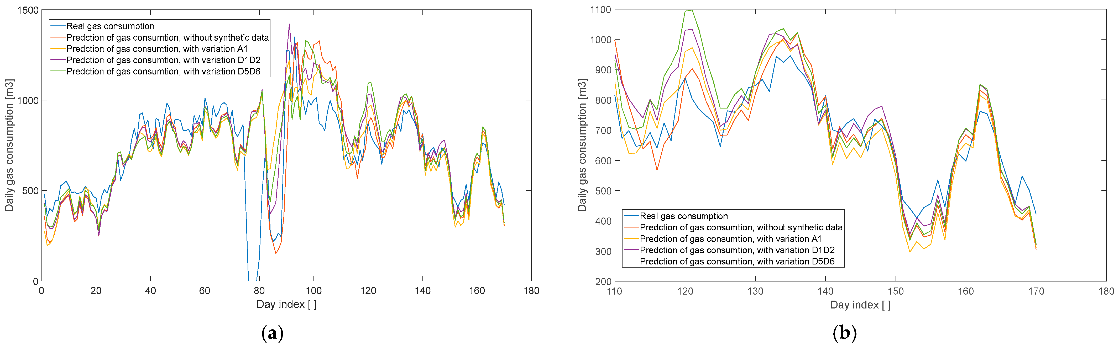 - To enhance the quality of the prediction, we expanded the dataset with synthetic data. These were generated using Wavelet Transform (see Figure 8), by varying approximation components and selected detail components (see Figure 9 and Figure 10). The quality of the augmented dataset was evaluated using normalised Mean Absolute Error (nMAE) and normalised Root Mean Square Error (NRMSE). Training results and comparisons with actual data from the 11th heating season are presented in Figure 14, Figure 15, Figure 16 and Figure 17, with nMAE and NRMSE values summarised in Table 5. However, this approach did not yield the expected improvement. The most promising results were achieved either by models trained on real data alone (computationally less demanding) or by using data with detailed components D1 and D2, varied only within the noise level. As demonstrated in Figure 18, a major limitation of this method is its inability to adequately capture consumption behaviour during operational interruptions caused by holidays.