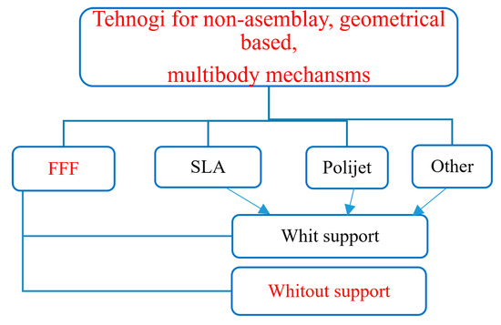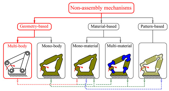 This division is conditional because geometry is the most important and crucial for all types of mechanisms; moreover, both single-body and multi-body mechanisms can be made of one or more materials, etc. This interconnection is shown in Figure 1 with a dashed line. Article [1] divides the first category of mechanisms into two parts: assembled mechanisms created by multiple bodies and single-body mechanisms. In this work, we focus on the first group of mechanisms created by multiple movable bodies, which are connected thanks to the geometry and made of a single material, see Figure 1—the category colored in red. The main challenges facing this type of mechanism can be systematized as follows: