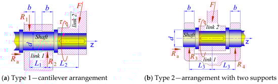 The rotational joint consists of two relatively rotating parts that are enclosed in such a way that their axial and radial displacement is not possible. They have one degree of freedom. These are some of the most commonly used connections between links in mechanical engineering and robotics. Such joints with sliding friction are considered, which are usually called plain bearings. According to the shape of the contacting surfaces, they are divided into cylindrical, conical, and spherical. Another division is made regarding the direction of the main load. Then, they are divided into radial and axial. Structurally (and from a topological point of view), the rotational joint can be implemented as a console (Figure 2a) or on two supports (Figure 2b).
