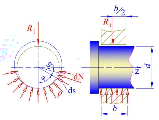 The dimensioning of classical plain bearings is usually done from a strength point of view. In specific cases of use, permissible heating or a condition for minimum permissible resistance are checked. Two main dimensions are important: the minimum diameter of the shaft and the minimum width of the bearing. There is no exact theory that would reflect all the features, and therefore the calculation of these bearings is of a conditional nature. The dependencies used are simplified by known assumptions, some of which are based on experimental data [33]. Using the scheme in Figure 2, the support reactions (for example: , и ) in the bearings are calculated. After that, the internal stresses in the shaft and its most endangered cross section are determined. The minimum diameter of the shaft can be calculated [34,35] for this cross section from the formula