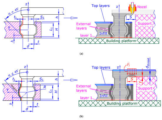 The ability to realize overhangs using FFF technology for 3D printing is important when realizing assembled structures. This allows the support structures to be significantly reduced and means that they do not need to be placed in the contact zones in rotational joints. Theoretical and experimental research of overhangs is considered in [26,27,28]. Different types of strategies for generating support structures and their placement are proposed in [29,30]. In many cases, when printing objects with FFF technology, support structures can be placed at a certain distance [31]. When printing a 3D object, it can have inclined sections relative to the building platform at an angle of up to 45 degrees, in which its shape does not change significantly [29,30]. For larger inclinations, it is recommended to place support structures. In [32], a new interesting strategy for cutting and printing overhangs without support material is proposed. This approach is based on changing the orientation of the printing nozzle in space and requires a specialized 3D printer.