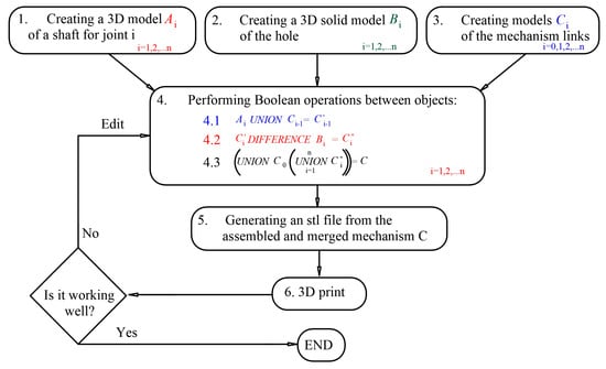 When designing and creating a 3D model for a non-assembly mechanism for FFF printing technology, recommendations in Section 2.3.1, Section 2.3.2, Section 2.3.3, Section 2.3.4 and Section 2.3.5 are followed. For creating non-assembly mechanisms with FFF technology, the following algorithm is proposed (Figure 7):