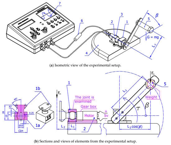 To carry out the experiment, a constant current gear-motor GM21 with a gear ratio i = 360:1, powered by a stabilized voltage of 5 [V] is used. The output speed without load at 6 [V] power supply is 23 [RPM], and the maximum torque of the gear-motor is 7434 [gr*cm]. As a result, the magnitude of the motor current I under load is measured—several rotations of the weight G. The data are taken using an electronic oscilloscope “Hantek—DSO-2090 USB” (7), passing through a shunt (measuring) resistance (6) with 1 [Ω]. Software for the oscilloscope “DSO-2090 USB”, that comes with it, was used. Each sample has a 3D-printed inscription, which indicates the clearance t in the bearing section b.