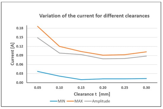 The graph is sinusoidal in nature, which corresponds to Formula (13). Numerous pulsations are observed, which are the result of inaccuracies in the manufacturing of the contact surfaces and disturbances in the system. For the obtained results, the following are determined: minimum current ; maximum current ; arithmetic mean value, as well as amplitude—A, for each of the samples—at different clearances and geometric shapes. The readings were made for six seconds of engine operation at an established mode.