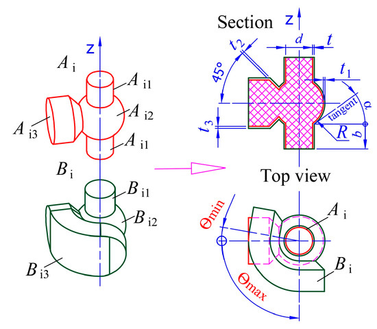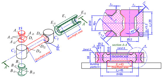 The section A-A marked in Figure 16 is presented in detail in Figure 17. Each rotational joint is created in the following way (Figure 17): a vertical shaft is modeled, which has the shape marked with . The cylindrical sections of the vertical shaft have a diameter d = 12 [mm], and the two conical sections , with a slope of [rad] are located midway between them. The middle cylindrical section is connected to a small horizontally oriented cylinder . The principle Section 2.3.2 is followed. Then a body is created for the hole. It has sections and which are similar to sections and , as they are increased by the necessary clearances and .