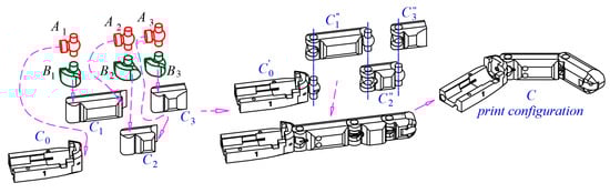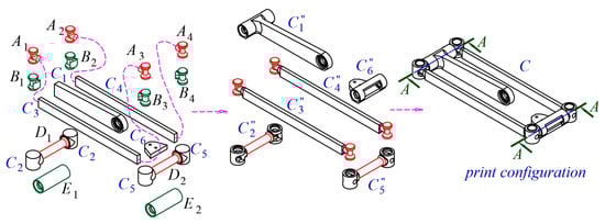 The shafts (colored in red) and are merged with their respective links . Links are obtained. The green bodies are removed from the links and to obtain the models and . The bodies and are merged, resulting in the links and . Link is obtained from the operation , and from . Finally, the bodies are merged into a single object .