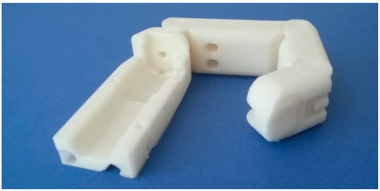 The fingers of the hand have an open (serial) structure and are modeled by strictly following the algorithm in Figure 7. The joints are of type 2 (Figure 2). The criteria proposed in point 2.3 are met. When creating these models, larger clearances t can be considered useful because this improves the adaptation of the finger when in contact with a grasping object. This fact facilitates the production of fingers with FFF technology. Here, however, the diameter d of the joints is limited (for different fingers it can vary within the range [mm] and is relatively small. This requires the use of materials (e.g., PLA) that are easy to print, of a small layer height, and with low printing speeds. It is believed that with the development of 3D printing technology and the introduction of new materials in the future, a similar approach will be suitable for creating prostheses and humanoid hands in robotics.
