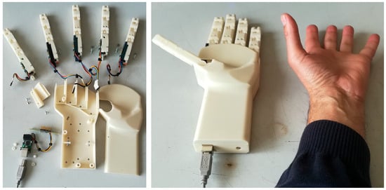 - Nikolov, V.; Georgiev, I.; Chavdarov, I. Hardware and software of a 3D printed humanoid hand. In Proceedings of the XXXII International Scientific Conference Electronics (ET), Sozopol, Bulgaria, 13–15 September 2023; pp. 1–6. [Google Scholar] [CrossRef]