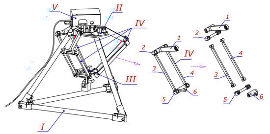 The main elements of the prototype: Base I, built from tubes and 3D-printed connecting elements; Fixed triangular platform II in which three servomotors and the hardware elements of the control system are mounted; III—triangular movable platform; IV—three identical 3D-printed assembled legs; V—Control module.