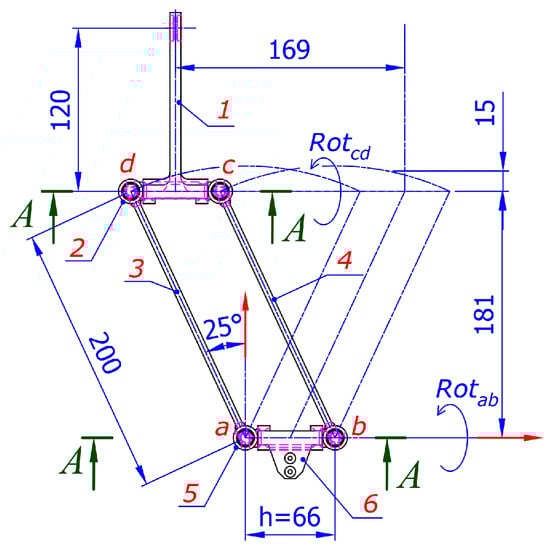 Each of the “legs” IV consists of six links (1 to 6) connected by rotational joints, which form a parallelogram mechanism (Figure 15 on the right). The lengths of links 3 and 4 are the same, as well as the lengths of links 2 and 5 (Figure 16).