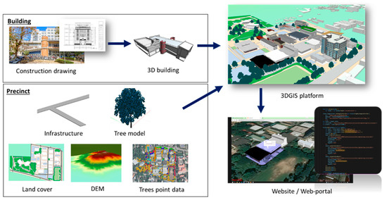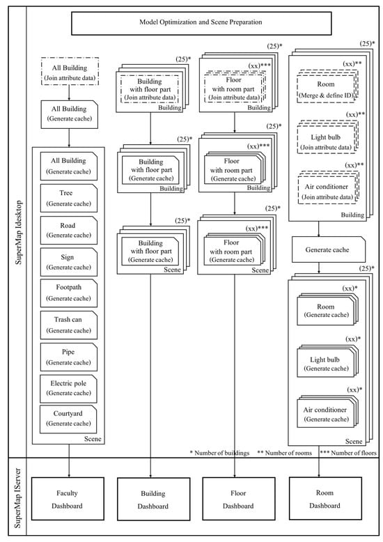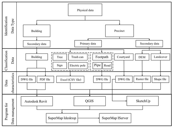 Both physical and sensor-derived data require preprocessing and segmentation to support accurate and real-time dashboard rendering. It involves aligning raw data inputs with predefined visualization layers, enabling structured data representation in the user interface. As illustrated in Figure 3, physical data is classified into three distinct categories: (1) Building Information, (2) Primary Site Information, and (3) Secondary Site Information. Building models were created from architectural drawings in AutoCAD Drawing 2018 (DWG) and PDF formats using Autodesk Revit 2022, ensuring compatibility with BIM workflows. Primary site data—such as road layouts and utility infrastructure—was collected in Excel, stored in a local comma-separated values (CSV) format and DWG formats, and processed through QGIS for spatial alignment. Secondary site data, which includes terrain, vegetation, and land use features, was represented using shapefiles and raster datasets and managed using QGIS Desktop 3.34.0 and SuperMap iDesktop 10i(2021) SP1.