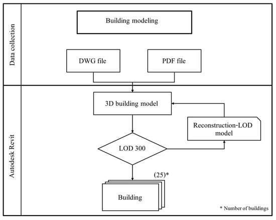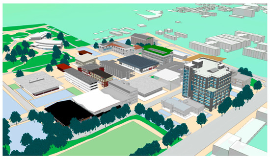 The physical resource survey focused on the Faculty of Engineering at Chiang Mai University and encompassed two primary categories: (1) building data and (2) precinct data. The survey was conducted between June 2021 and January 2022. The building dataset comprised 25 structures with a combined gross floor area of approximately 96,000 square meters. Architectural drawings were available for most buildings in Computer-Aided Design (CAD) and Portable Document Format (PDF) formats, facilitating the development of Level of Development (LOD) 300 BIM models using Autodesk Revit (Autodesk, Inc., San Rafael, CA, USA), SketchUp (Trimble Inc., Sunnyvale, CA, USA), and other modeling tools. According to the survey, the availability of architectural documentation was generally high, which was critical for accurate 3D reconstruction. In cases where drawings were missing or incomplete, on-site visits and manual measurements were conducted.