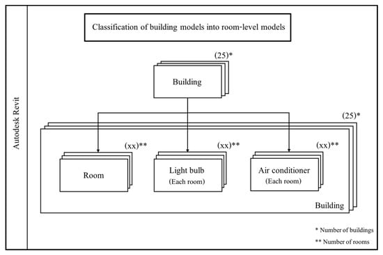 - Three-Dimensional Model Generation: Using Revit to create LOD 300 building models from architectural drawings. Only architectural elements, doors, windows, and energy-use components (e.g., air conditioning (AC) units, lighting) are modeled to minimize data load and enhance rendering performance (Figure 5).