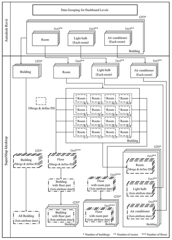 - Data Grouping for Dashboard Levels: Data are grouped into four layers for visualization—faculty-level, building-level, floor-level, and room-level. Merged model parts are tagged with unique identifiers (IDs) and joined with attribute tables for Application Programming Interface (API) access (Figure 6 and Figure 7).