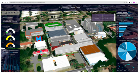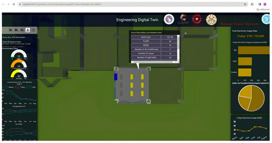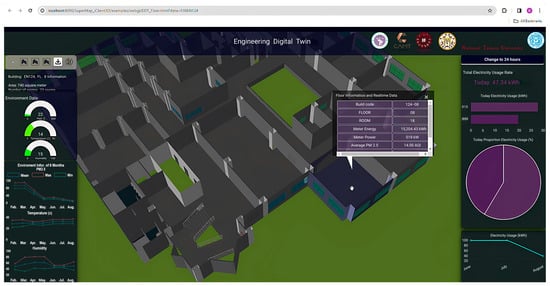 This study presents the design and implementation of a dynamic digital twin system tailored to CMU’s operational context. The system integrates Revit-based BIM models, spatial data from quantum geographic information system (QGIS) and SuperMap, real-time sensor streams (e.g., particulate matter less than 2.5 µg/m3 (PM2.5), temperature, humidity), and web-based dashboards for interactive visualization. By combining static and real-time data, the platform enables multilevel visualization—ranging from faculty-wide overviews to room-level insights—supporting energy management, space optimization, and environmental monitoring applications.