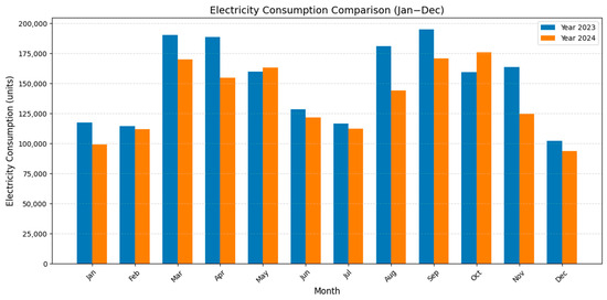 Previous studies highlight that overall energy consumption in campus buildings typically includes electrical loads (lighting, plug loads, and HVAC systems) and thermal energy for heating or hot water supply, depending on the climatic context. For example, Kapalo and Adamski [42] analyzed heat consumption in buildings located in moderate climates, where heating demand strongly influenced overall usage. In contrast, in tropical climates such as Thailand, electricity dominates total energy consumption, with HVAC and lighting being the primary contributors.