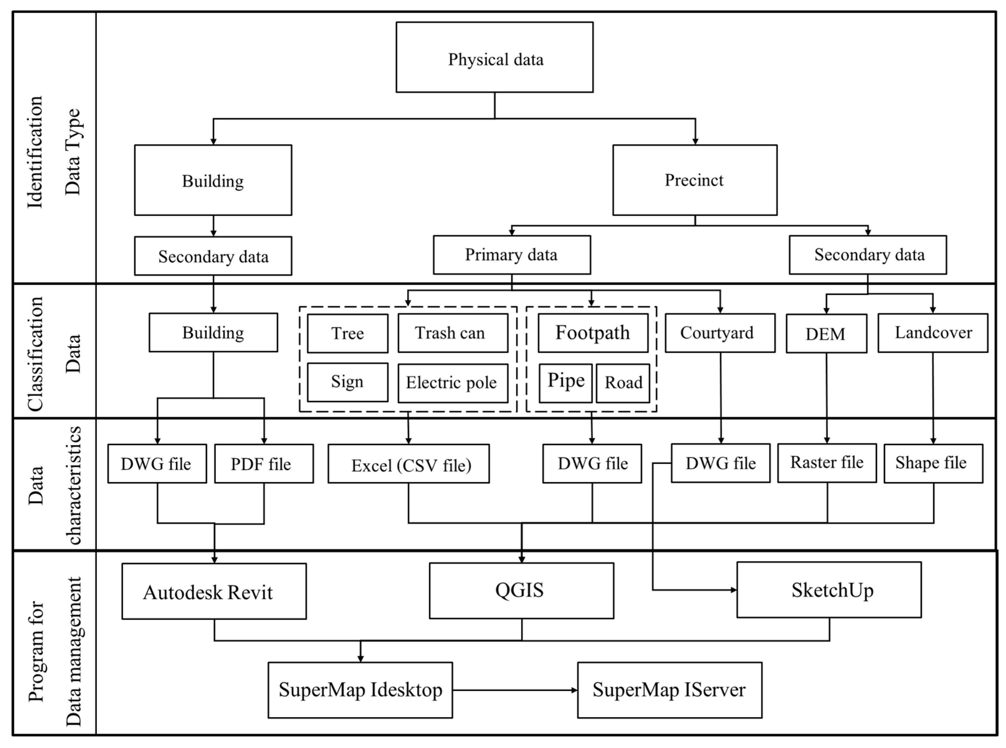 The physical resource survey focused on the Faculty of Engineering at Chiang Mai University and encompassed two primary categories: (1) building data and (2) precinct data. The survey was conducted between June 2021 and January 2022. The building dataset comprised 25 structures with a combined gross floor area of approximately 96,000 square meters. Architectural drawings were available for most buildings in Computer-Aided Design (CAD) and Portable Document Format (PDF) formats, facilitating the development of Level of Development (LOD) 300 BIM models using Autodesk Revit (Autodesk, Inc., San Rafael, CA, USA), SketchUp (Trimble Inc., Sunnyvale, CA, USA), and other modeling tools. According to the survey, the availability of architectural documentation was generally high, which was critical for accurate 3D reconstruction. In cases where drawings were missing or incomplete, on-site visits and manual measurements were conducted.
