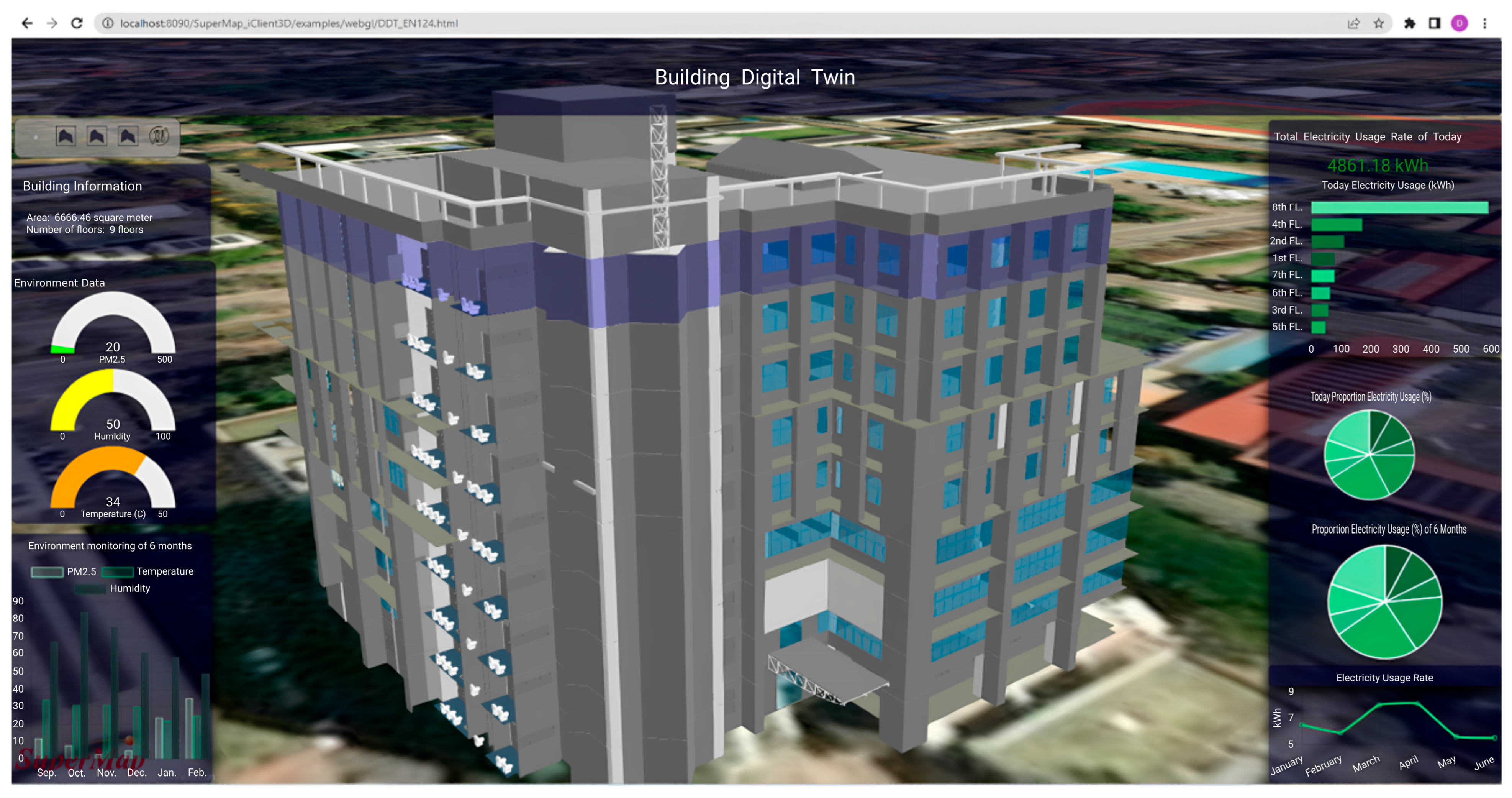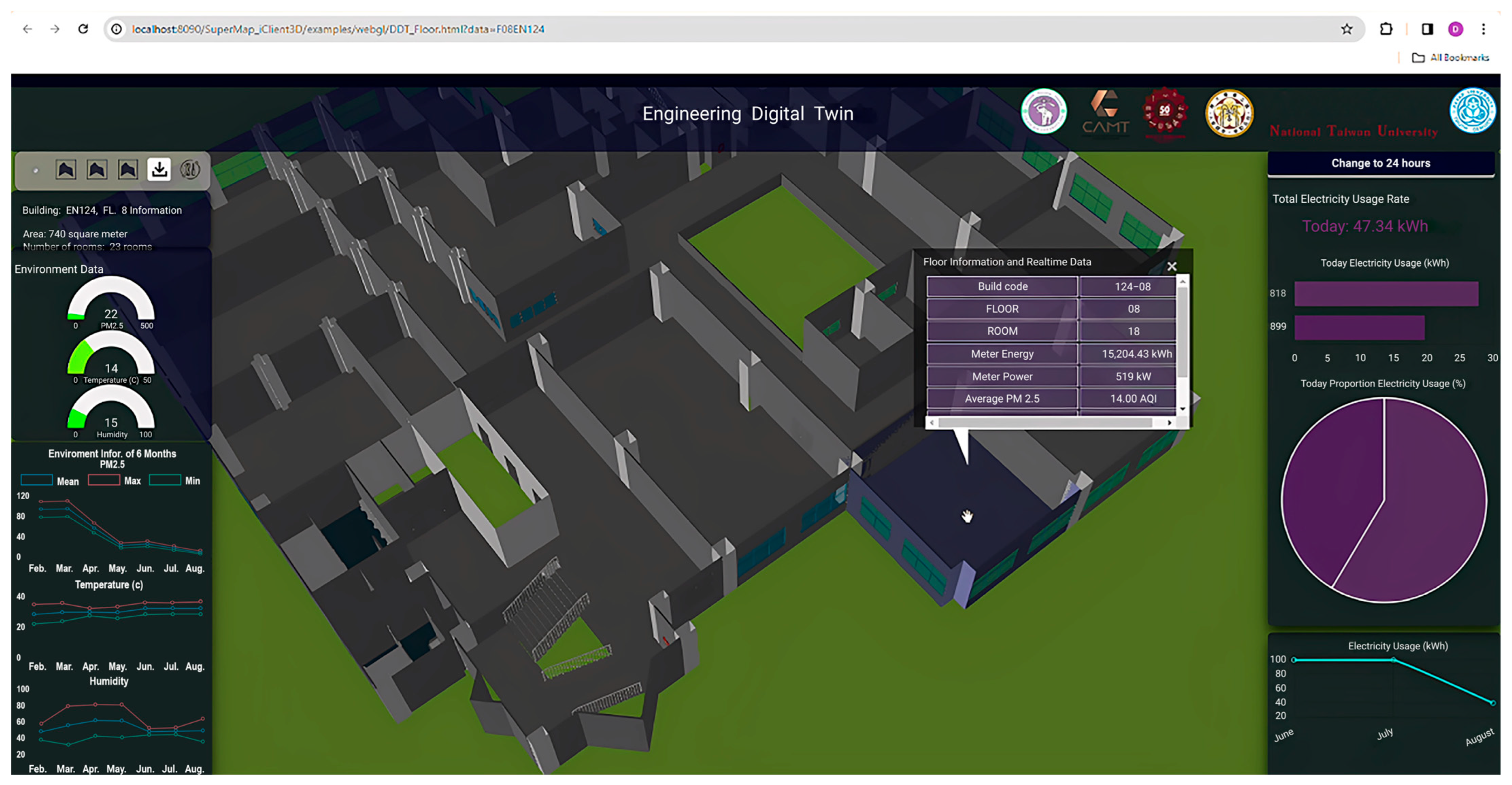This study presents the design and implementation of a dynamic digital twin system tailored to CMU’s operational context. The system integrates Revit-based BIM models, spatial data from quantum geographic information system (QGIS) and SuperMap, real-time sensor streams (e.g., particulate matter less than 2.5 µg/m3 (PM2.5), temperature, humidity), and web-based dashboards for interactive visualization. By combining static and real-time data, the platform enables multilevel visualization—ranging from faculty-wide overviews to room-level insights—supporting energy management, space optimization, and environmental monitoring applications.