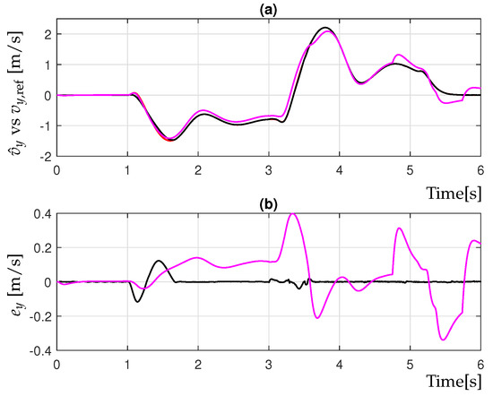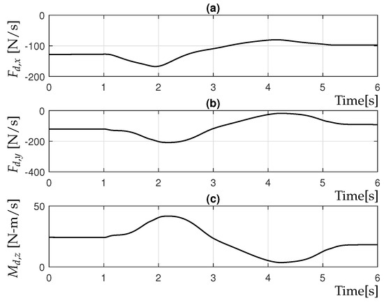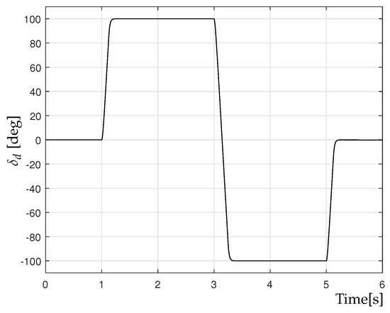 To solve the control problem, it must be assumed that references and , as well as their derivatives and , are bounded and compatible with vehicle dynamics. For this purpose, the following reference model is used: