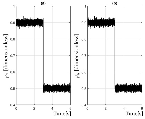 The initial conditions for the maneuver in the CarSim simulation were set as follows: m/s, m/s, and rad/s. To introduce a significant challenge for the proposed control system, the longitudinal and lateral tire–road friction coefficients and were assumed to undergo an abrupt transition from dry-road conditions to wet-road conditions , as illustrated in Figure 2. Furthermore, these friction coefficients were perturbed by white noise, modeled as for s and for s, where represents a white noise signal.