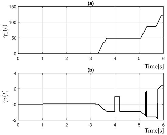 where and denote the time-varying adaptive gains associated with the HOSM controller defined in (32).