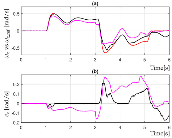 Furthermore, the proposed HOSM controller using adaptive gain (32) was compared with the controller designed by Sliding Modes (62). In order to have a fair comparison between the proposed controller (32) and SMC (62), the control gains in Table 1 were used. Figure 6a and Figure 7a present the observer variables and along with the references and to be tracked. Additionally, Figure 6b and Figure 7b depict the tracking errors and , respectively. It is possible to notice in Figure 6b and Figure 7b that the proposed controller (32) has a better performance than SMC (62). The parameters considered in the reference model given in (29) are presented in Table 3.
