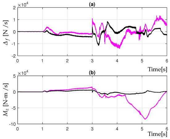 Figure 8 presents the behavior of the active controls, such as (due to the AFS input) and yaw moment (due to RTV input),of the scheme proposed in this article (32), demonstrating good tracking between the variables and the reference (see Figure 6 and Figure 7). In addition, Figure 9 and Figure 10 show the behavior of the gains of the and control inputs. Moreover, as shown in Figure 8, the proposed controller (32) requires less control effort than the classical SMC (62), resulting in reduced stress in the actuators. Therefore, the proposed controller (32) provides a better general performance with respect to SMC (62).