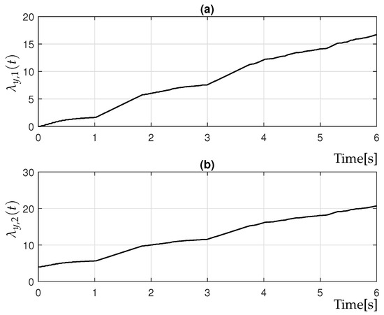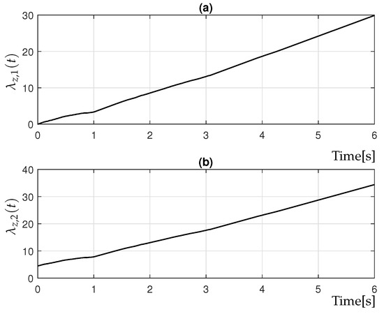For to be negative definite, the matrix must be positive definite, which is ensured through the appropriate selection of adaptive gains in (34). According to Sylvester’s criterion, positive definiteness of requires all its leading principal minors to be strictly positive, yielding the following two conditions: