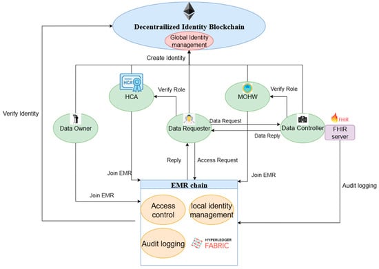 This figure illustrates the high-level system architecture, showcasing the enhanced electronic medical record (EMR) exchange system proposed in this study. The system comprises three key components: a decentralized identity blockchain (DID-chain), an application-layer blockchain (EMR-chain), and FHIR servers provided by individual hospitals.