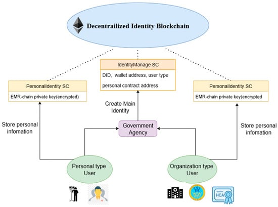 This figure presents the DID-chain, which is designed to serve as a global identity management system. In this system, identities are referred to as Main Identities. At its core, the system comprises two smart contracts: IdentityManager and Personal.