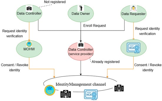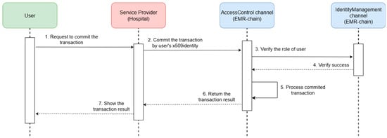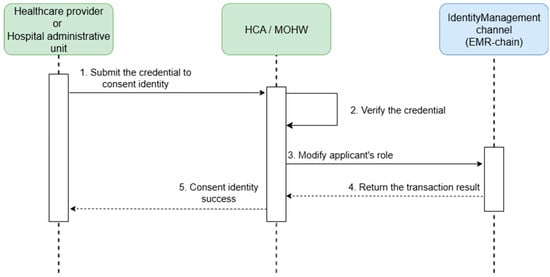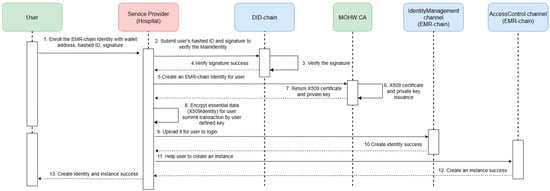 This channel (Figure 4) establishes an application-specific identity system on top of the global DID-chain. It manages roles within the EMR ecosystem, which is essential for enforcing fine-grained access control.