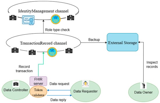 To ensure interoperability and align with Taiwan’s national healthcare strategy, the system mandates that each participating hospital operate a server compliant with the Fast Healthcare Interoperability Resources (FHIR) standard [22]. These servers act as the distributed, off-chain repositories for EMR data, utilizing a “resource”-based data model for granular and standardized data exchange.