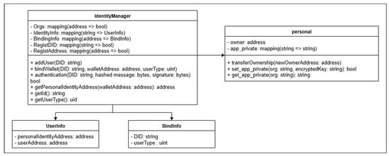 This figure depicts the smart contract architecture of the DID-chain. This architecture primarily consists of two smart contracts: the IdentityManager contract and the Personal contract.