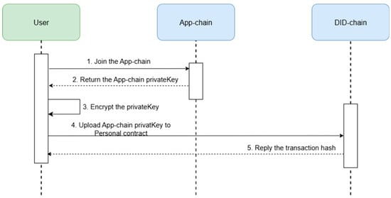 The DID-chain serves as the system’s global identity layer, implemented on the Ethereum blockchain to leverage its mature ecosystem of digital wallets. On this chain, user identities are called ‘Main Identities’ and are primarily managed by two core smart contracts: IdentityManager and Personal. The IdentityManager contract is responsible for creating and managing user identities after verification by a trusted authority, such as a government agency. Conversely, the Personal contract is a dedicated contract created for each user, serving as a secure, user-controlled vault for personal information, such as encrypted private keys for other application chains. For a detailed design of the IdentityManager and Personal smart contracts, including their pseudocode and functional descriptions, please refer to Appendix A.1.