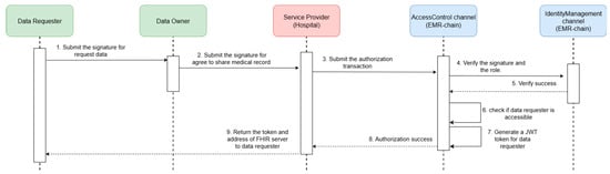 The authorization() function orchestrates the entire secure access process. In alignment with Taiwanese EMR exchange protocols, the function first performs rigorous identity verification for both the patient and the healthcare provider using digital signatures. It achieves this by invoking the authenticate_identity() function from the IDM chaincode, which uses the on-chain public keys to validate the signatures and confirm that the participants hold valid “doctor” or “patient” roles.