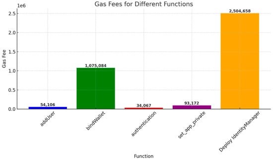 Gas Fee Consumption: A measure of the transaction cost required to deploy smart contracts and execute functions on the Ethereum-based blockchain (DID-Chain). The manuscript notes that the gas cost of the set_app_private() function is proportional to the size of the input data.
