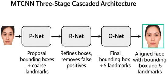 The Multi-Task Cascaded Convolutional Neural Network (MTCNN) [8] is a popular method for face detection and alignment, and is essential in face recognition system preprocessing. MTCNN operates through a three-stage cascade to identify faces and facial landmarks, remaining effective despite changes in scale, pose, and lighting. Its high accuracy and speed have made it a preferred choice for facial detection in real-world applications, such as the proposed hybrid model, where it functions as the first step for face localization and alignment before feature extraction. It employs a three-stage cascaded architecture, illustrated in Figure 1, where each stage consists of a dedicated CNN that progressively refines the results from the previous stage. This design enables efficient processing by quickly rejecting non-face regions in the early stages, while devoting more computation to promising candidates.